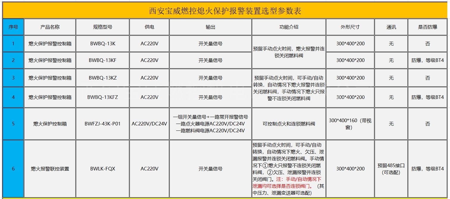 BWBQ-13KF熄火保护报警控制箱,具有熄火联锁保护功能。内装紫外线火焰检测器,在线实时监测火焰,当系统运行中出现意外熄火,声光报警器(默认蜂鸣器,可选配声光报警或者声光喇叭)鸣叫并关闭燃气电磁阀,保证系统运行安全并可将着火、熄火信号以开关量的形式上传至上位机,便于操作人员进行监控。适应于燃气工业炉、钢包烘烤器等。